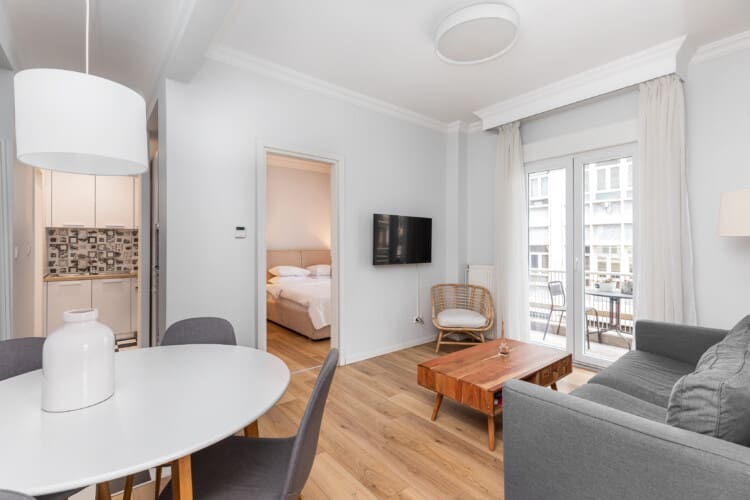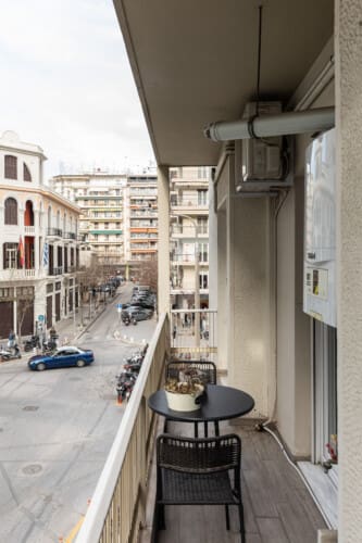 One of the highlights of our apartment is the balcony with street view, where you can enjoy your morning coffee, read a book, or simply soak up the lively atmosphere of Thessaloniki.