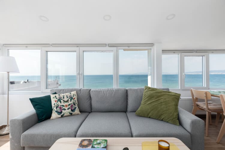 The living room is warm and inviting, with a sofa-bed for extra guests, and large windows that surround the space, filling it with natural light and providing gorgeous sea views from multiple angles.