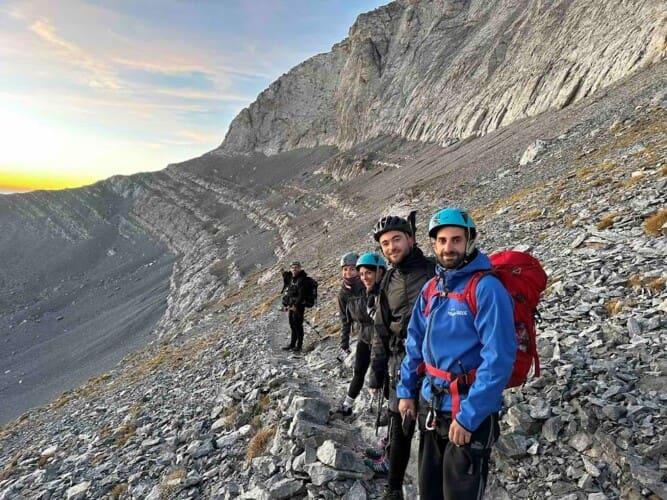 The climb to Mytikas peak at an altitude of 2918 meters will take place on Saturday afternoon or on Sunday morning depending on the weather conditions and the mood of the team. The ascent will be done with the use of appropriate climbing safety equipment (helmet, climbing zone, rope) and the help of experienced guides and climbing instructors. The ascent to the top will take about 3 hours.