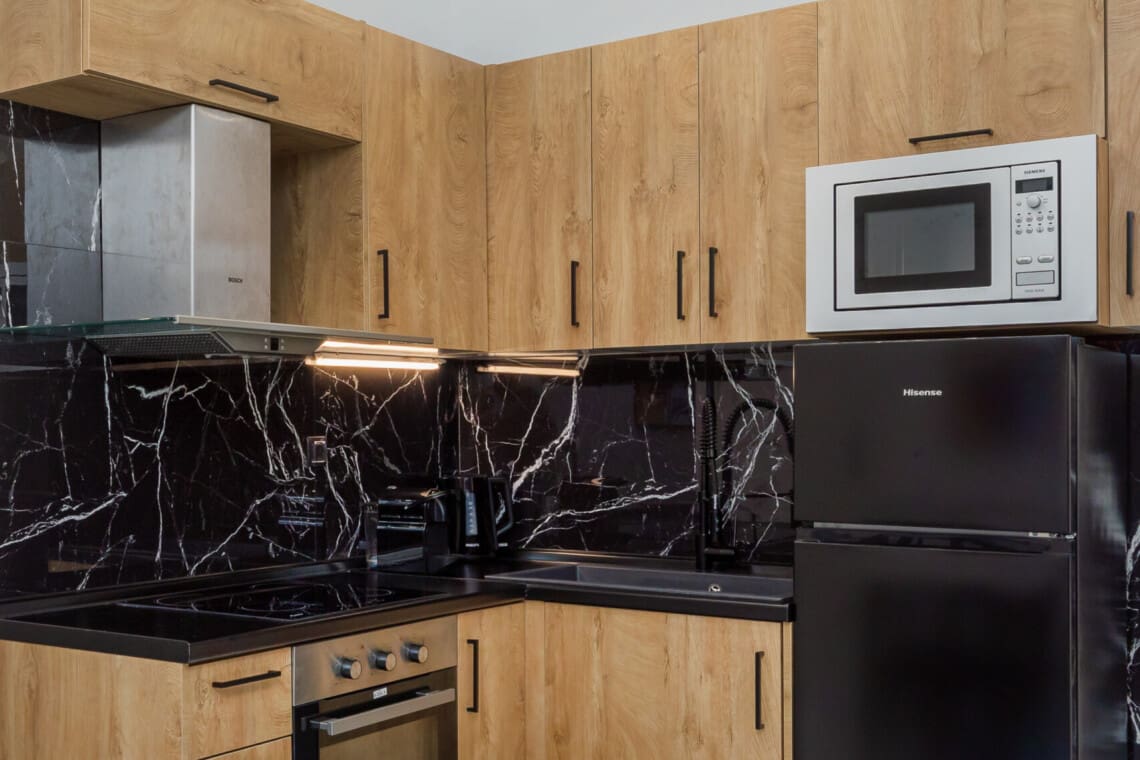 The bedroom is a haven of tranquility, featuring a comfortable double bed dressed in fine linens to ensure a restful night’s sleep. Wake up refreshed and ready to explore the vibrant city that awaits outside your doorstep. Our bathroom offers a spa-like experience with a luxurious rainfall shower head, perfect for unwinding after a day of adventure. The full kitchen is equipped with everything you need to whip up a delightful meal, seamlessly connected to a dining area where you can enjoy your culinary creations or a lovely home-brewed coffee in the morning.