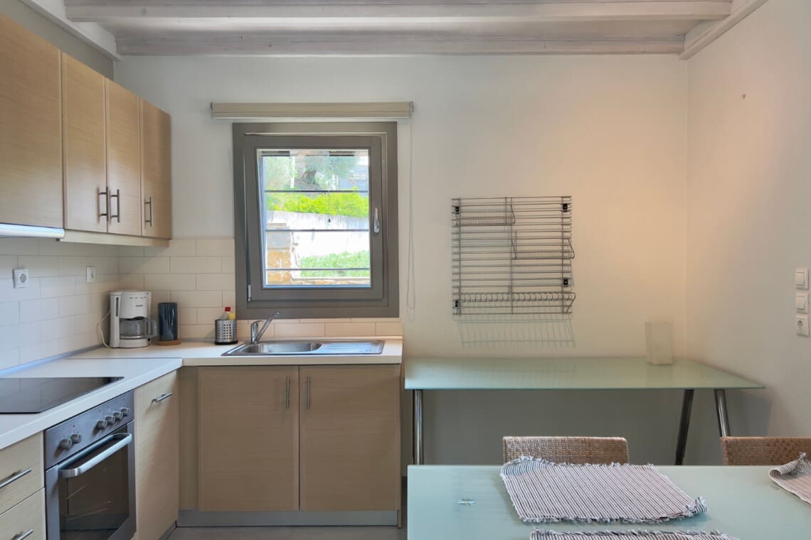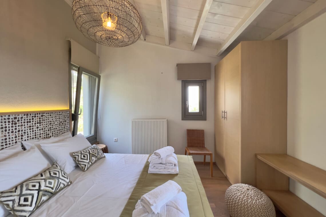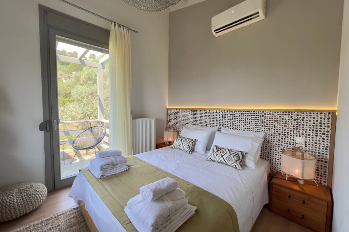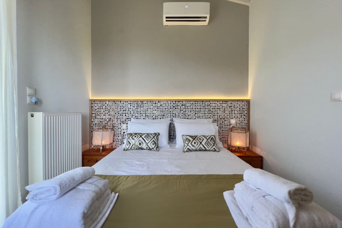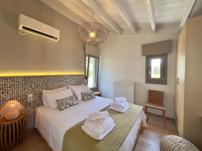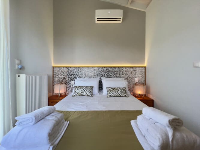 As you step into our lovely villa, you’ll be greeted by the cozy ambiance and comfortable furnishings that create a warm and inviting atmosphere. With two spacious bedrooms, each featuring a luxurious Queen bed, you and your loved ones will enjoy a restful night’s sleep, ensuring you wake up refreshed and ready to explore all that Skiathos has to offer.