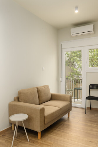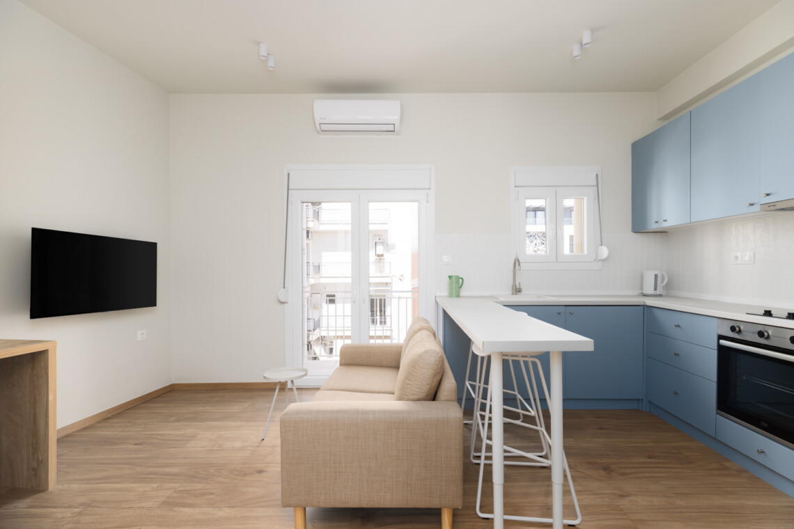 This 25 m² one-bedroom apartment at Celine Volos by halu! is designed for travelers who want both comfort and independence. It features a double bed with soft linens, a cozy couch, and a Smart TV, perfect for relaxing after a day in the city.