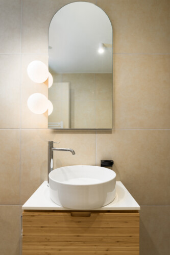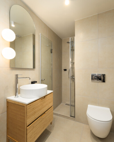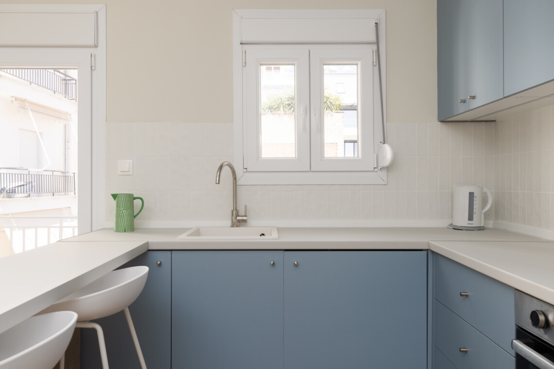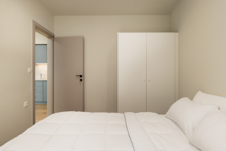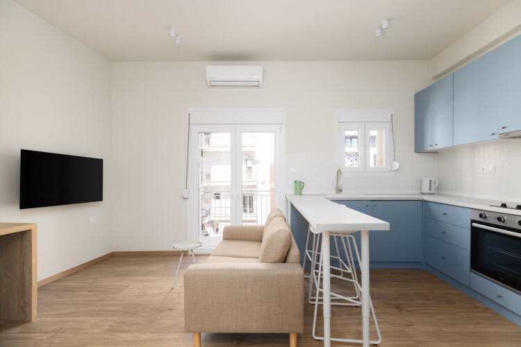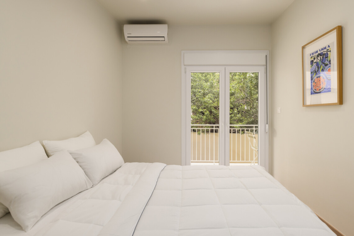 The apartment is bright, compact, and thoughtfully furnished, with light wood tones and modern simplicity. Air conditioning ensures comfort year-round, and guests also have access to a shared washing machine in the building, convenient for longer stays.