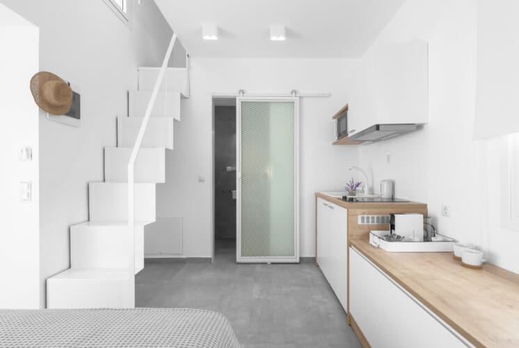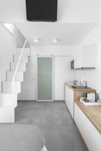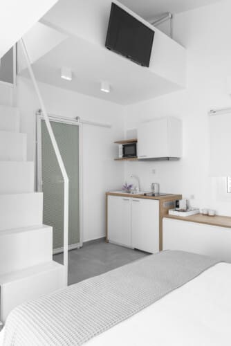 Α recently constructed fully furnished, light, airy and comfy studio with 1 room, 1 small loft and a big terrace. The studio has storage spaces (drawers), a hanger, a double bed and a big single adult size loft bed. There is a fully functional kitchen with all the necessary equipment: dinnerware, cutlery, glassware, Nespresso coffee machine (with complementary Nespreso capsules), toaster, kettle, refrigerator and microwave.