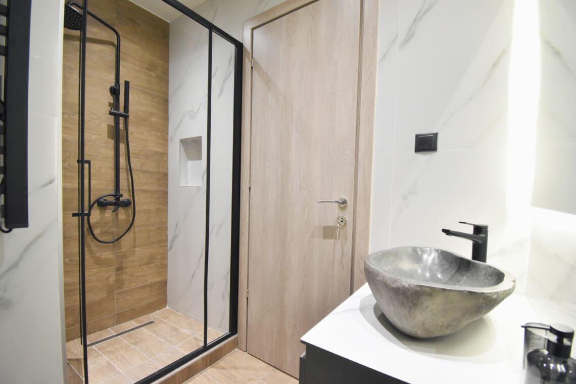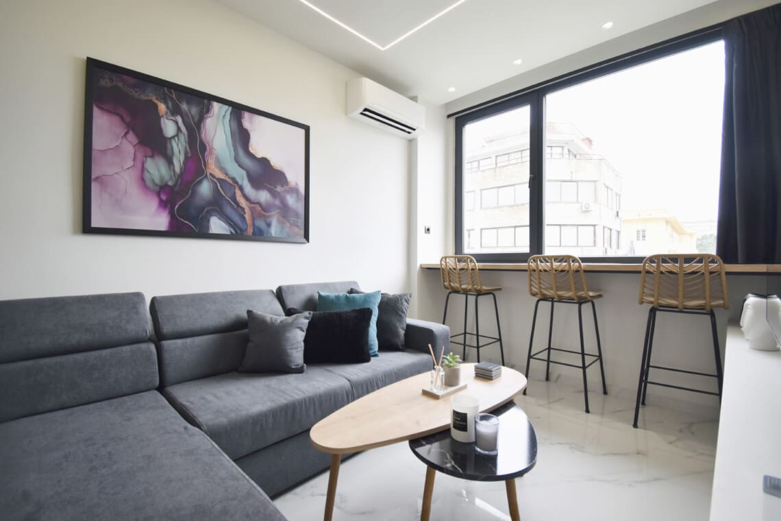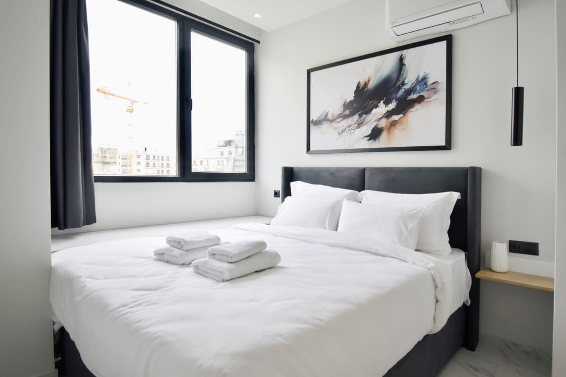 Our apartment features a window wall, flooding the space with natural light and offering a lovely view of the lively neighborhood. Step outside and you’re in the heart of Thessaloniki! You’re just a short walk away from trendy cafes, delicious restaurants, and popular attractions. We’ve thought of everything to make your stay as comfortable as possible. From high-speed Wi-Fi to air conditioning, you’ll feel right at home.