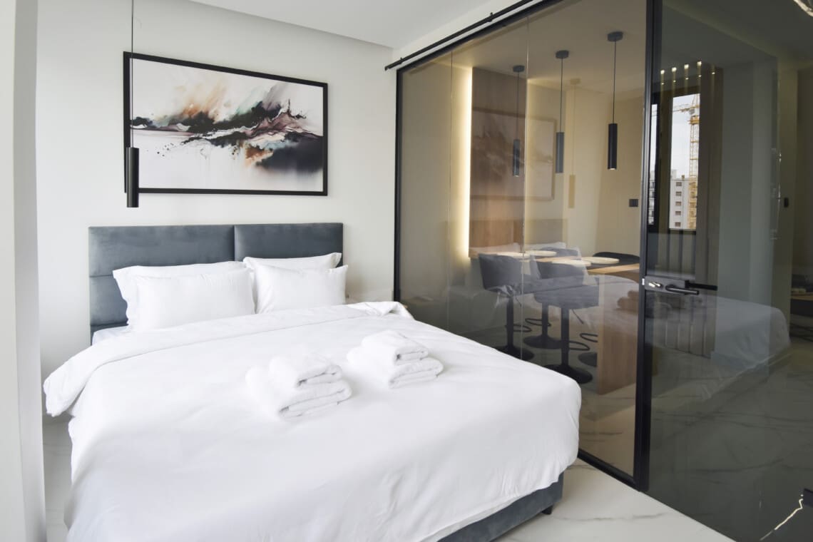Enjoy restful nights in a comfortable double bed. Wake up feeling refreshed and ready to explore the city. Relax and unwind in the spacious living area with a cozy couch and a flat-screen TV. It’s the perfect spot to chill out after a day of sightseeing. Indulge in a luxurious shower with our rainfall shower head. Fresh towels and essentials are provided for your convenience.