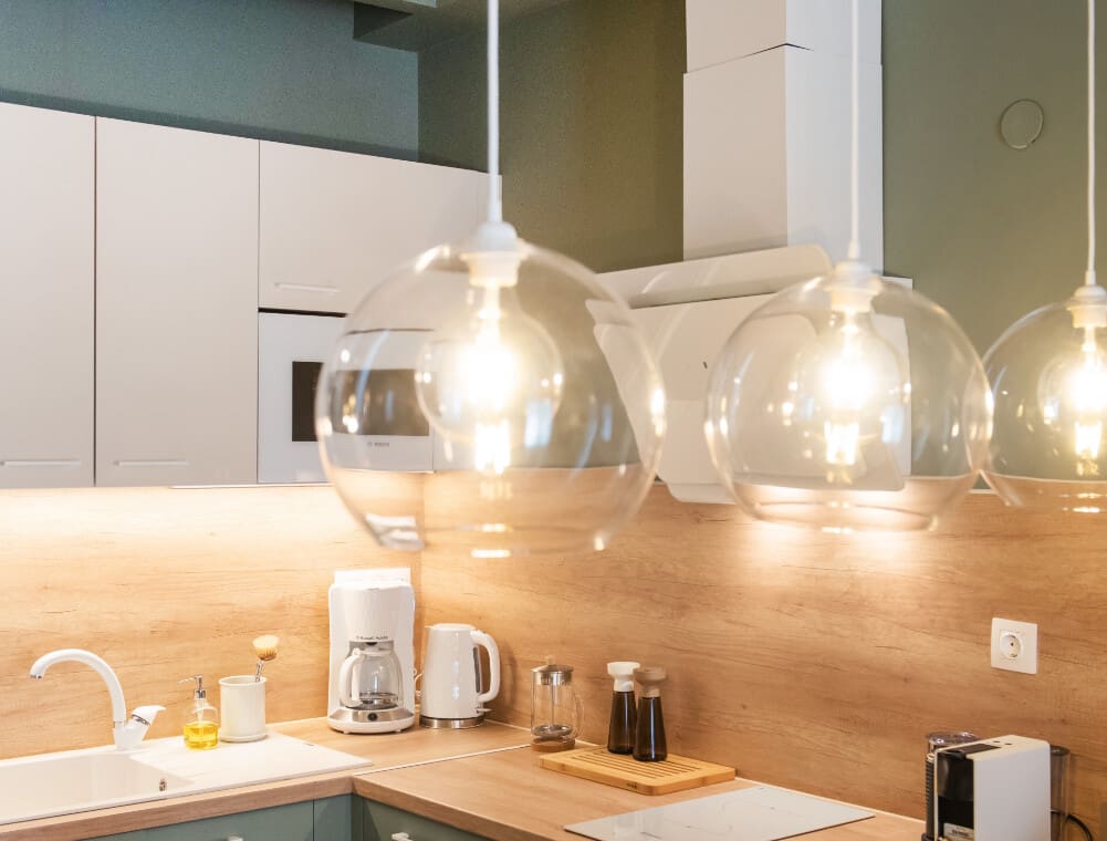 The apartment features a comfortable queen-size bed that ensures a good night’s sleep, while the spacious living room has a large 60 inch smart TV that will provide entertainment throughout your stay. The living room connects to a fully equipped kitchen, complete with a dishwasher, microwave, oven, and stovetop. Additionally, there’s a built-in dining area for two people, making mealtime convenient and hassle-free.