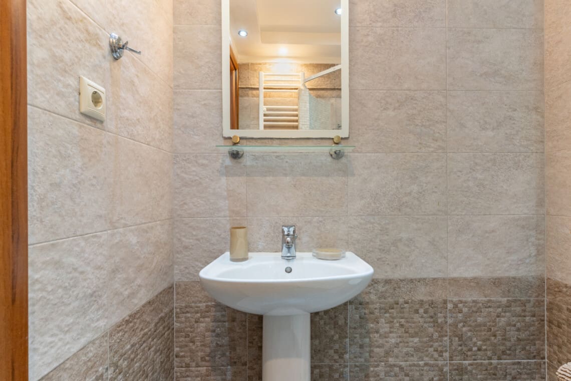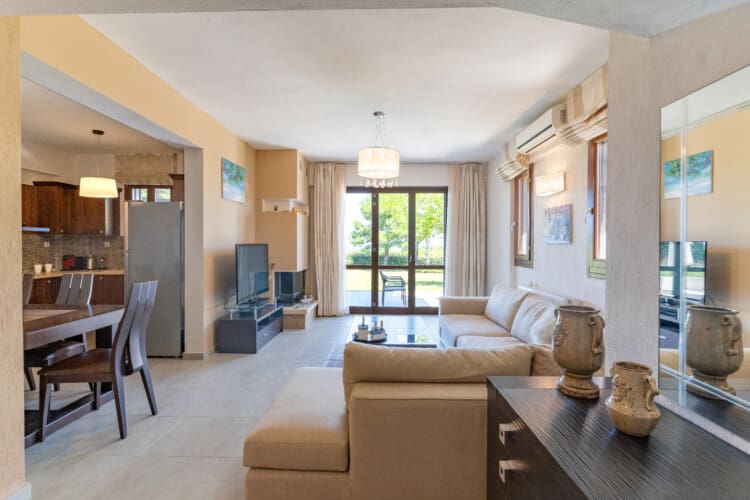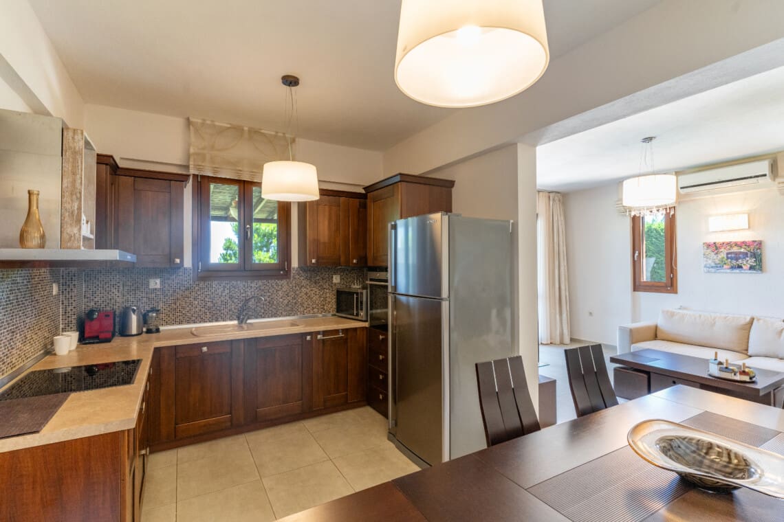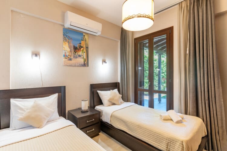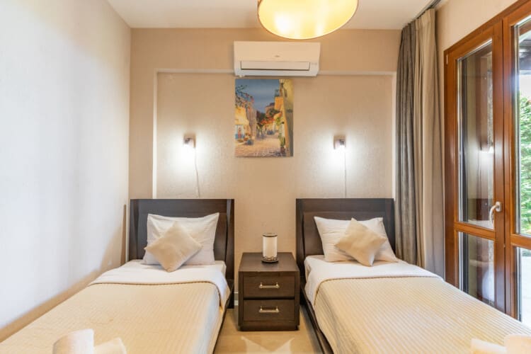 As you step into each villa, you will be greeted with an elegantly designed space that seamlessly blends comfort and sophistication. On the ground floor, you will find one bedroom with 2 single beds, a cozy living room, a fully equipped kitchen, a dining area, and one full bathroom. Everything you need to feel at home is at your fingertips.