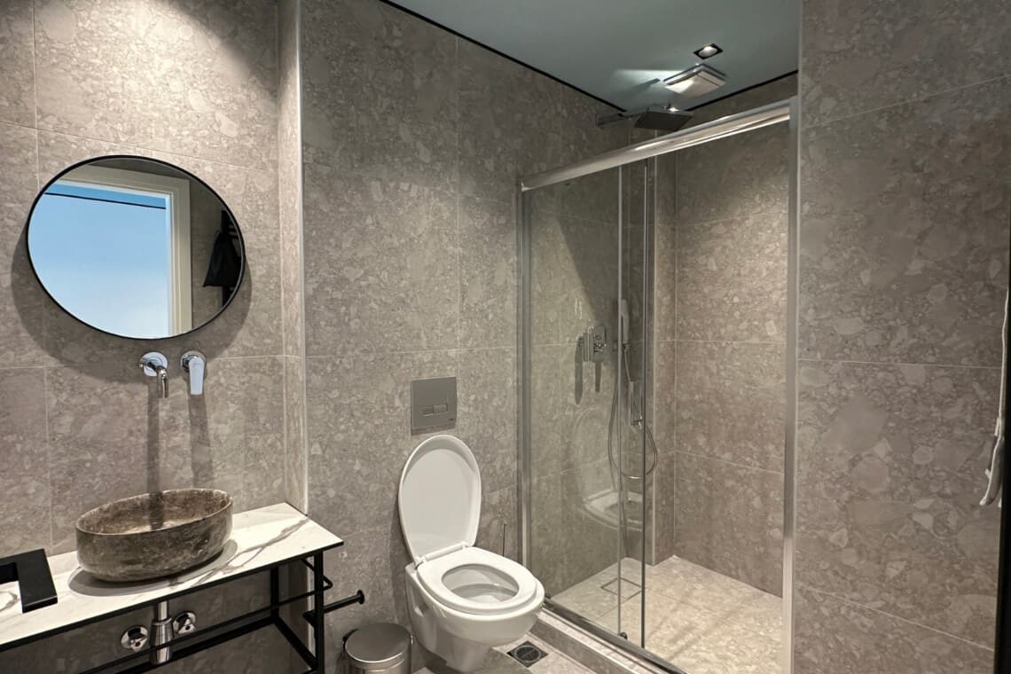 Adjacent to the bedroom, you’ll find a stylish bathroom equipped with all the essential amenities. Whether you’re indulging in a rejuvenating shower or getting ready for a night out in the city, our modern facilities ensure your utmost convenience.