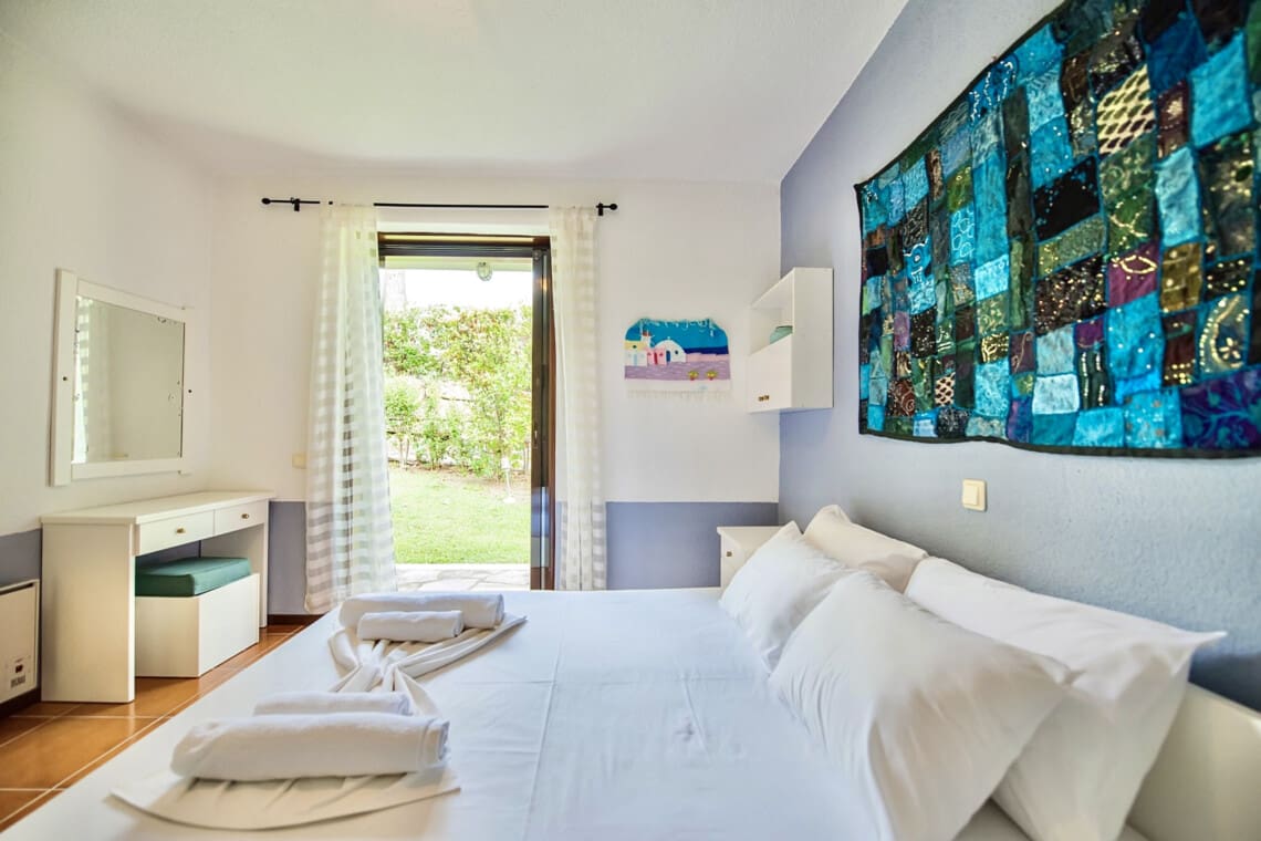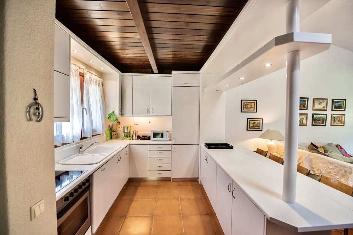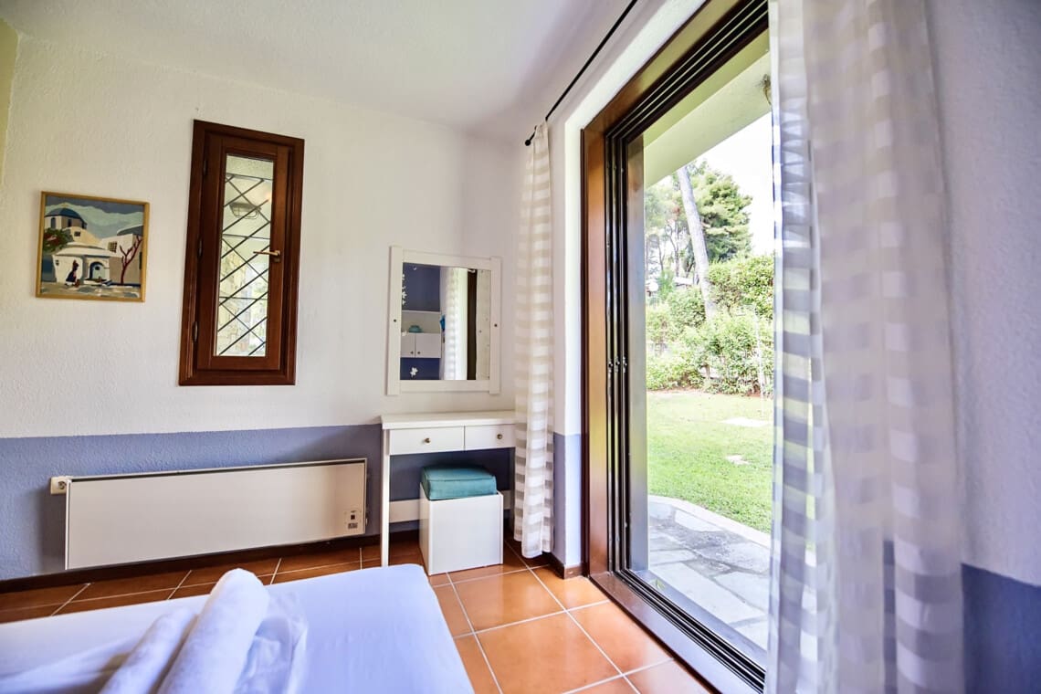 This idyllic villa offers high-speed Wi-Fi, a necessity for those who want to combine vacation with inspiration & work in a quiet environment. The ground floor has a fully equipped kitchen (Nespresso, oven & stove, cookware, fridge, dishwasher). In addition, there is a spacious living room, a Plasma TV, and a bathroom (with bathtub and care products). The master bedroom has a comfortable queen-size bed, while the second bedroom has 2 single beds. On the upper floor of the villa, there is a bright room with a queen double bed as well as an en suite bathroom (with shower and care products). The house has a private 800 sqm garden, while the villa is located in the beautiful green Sani forest. The guests have unlimited access to our shared swimming pool & private parking.